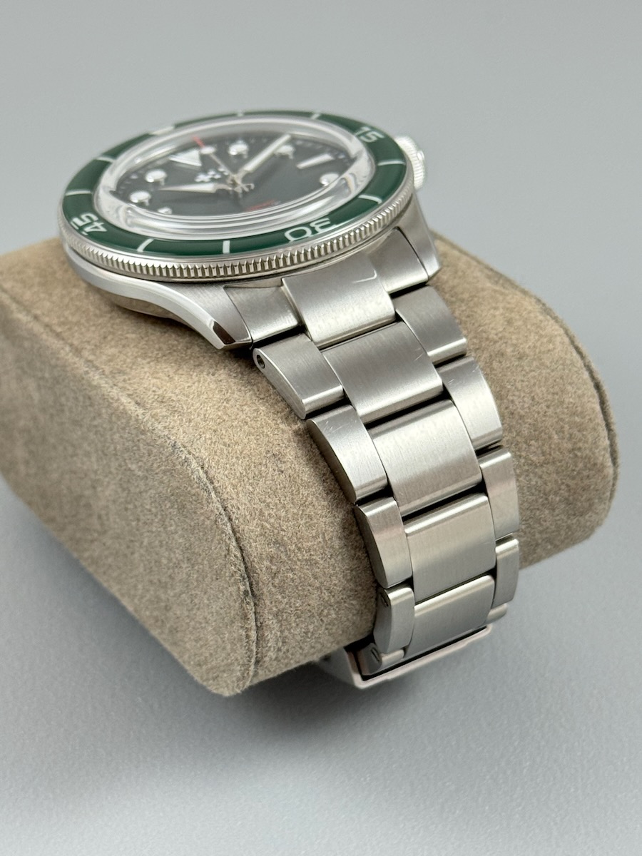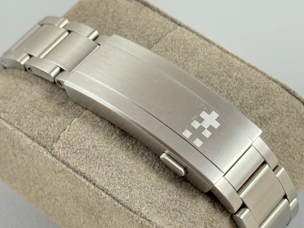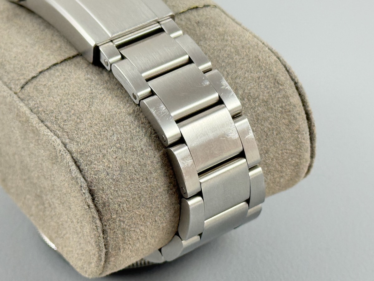 Bracelet: Some wear on the back side of the bracelet from desk diving. One small mark on the front near the case. All links included, should fit about 8″ wrist.